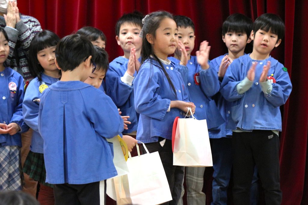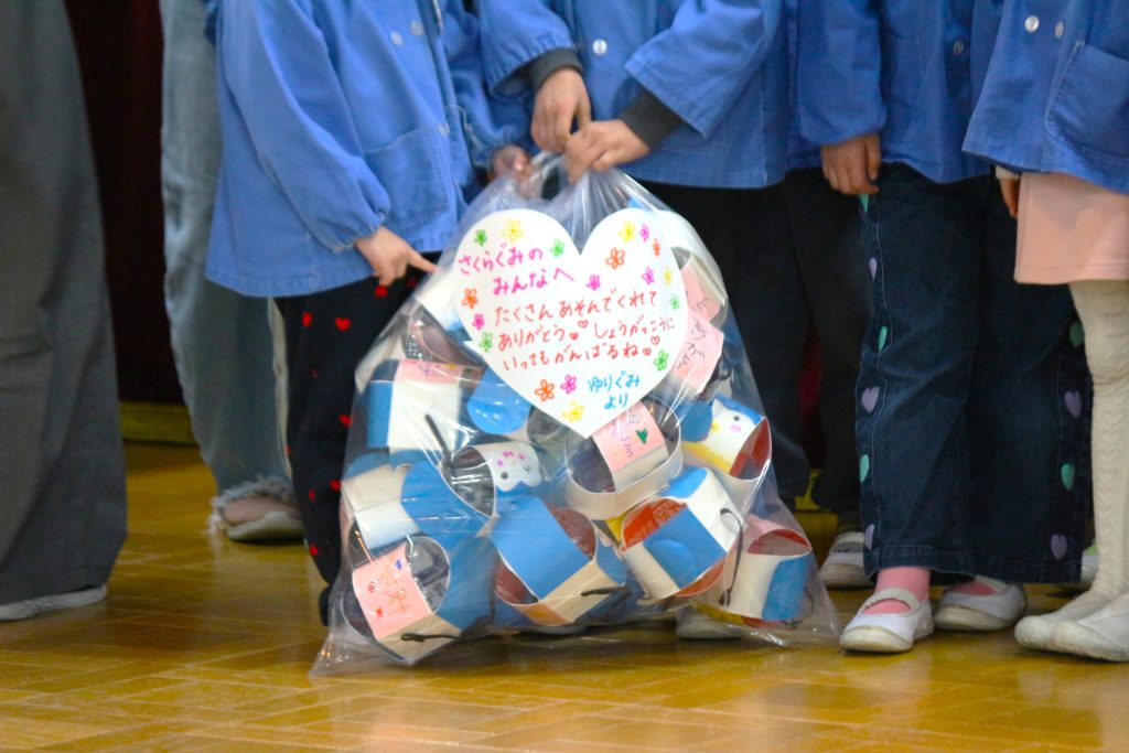 2026.03,11 卒園児を送る会 いよいよ年長組の卒園が近づいてまいりました。 卒園児を送る会ということで、全園児が集まり、年長組さんに各学年からプレゼントを渡しました。 年長組さんからも手作りのペンギンのヨーヨーをいただきました。 お兄さん・お姉さんたちにはたくさんお世話になりました。 小学校でも頑張ってくださいね!! 一覧に戻る